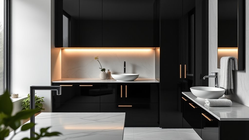 Black cabinets can effortlessly shift your bathroom’s style from vintage elegance to contemporary chic. By choosing sleek designs and integrating modern materials, you can create a space that feels fresh and inviting.