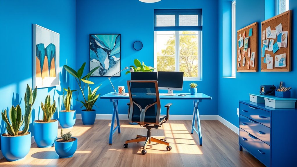 Consider adding blue accents with art or plants to invigorate the space without overwhelming it. Blue workspace productivity flourishes when you create distinct zones for brainstorming, meetings, and relaxation.