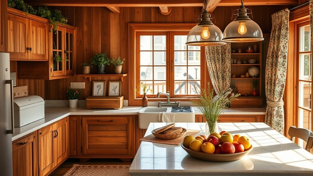 Don’t forget about vertical space; wall-mounted racks can beautifully showcase pots and pans. With these strategies, you’ll create a cozy kitchen that not only looks inviting but also enhances your cooking flow.